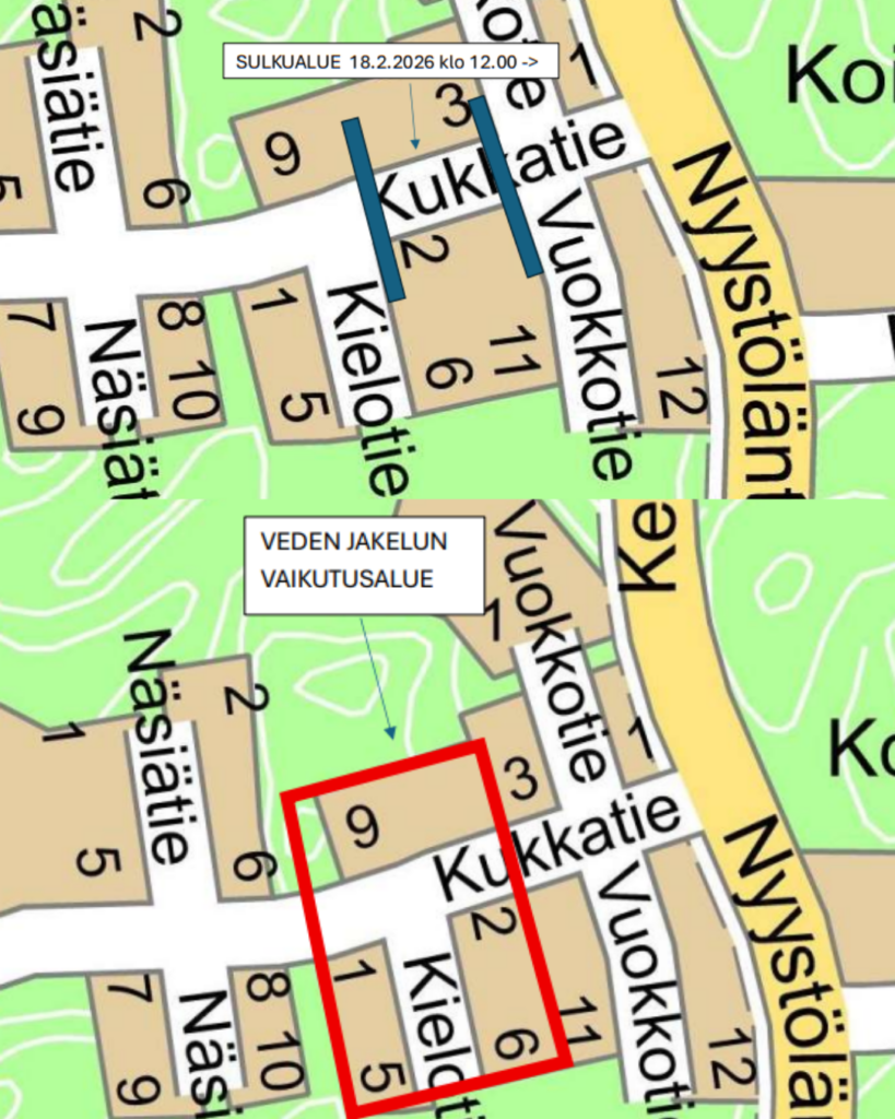 Padasjoella löytyi ti 17.2. suurehko vesivuoto Koiravuoren asuinalueella. Korjaustyöt alkavat ke 18.2.2026 kello 12.00, jonka seurauksena suljetaan Kukkatien liikenne Kielotien ja Vuokkotien väliseltä alueelta (kuvan karttaan merkitty). Sulun kestoa ei osata vielä kertoa, mutta pyrimme saamaan korjauksen viikonloppuun mennessä.