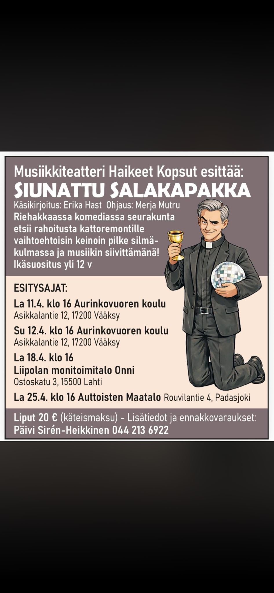 Riehakkaassa komediassa Kuusimäen seurakunta etsii rahoitusta kattoremontille vaihtoehtoisin keinoin pilke silmäkulmassa ja musiikin siivittämänä. Ikäsuositus yli 12 v. Lisätiedot ja ennakkovaraukset Päivi Sirén-Heikkinen 044 2136922
