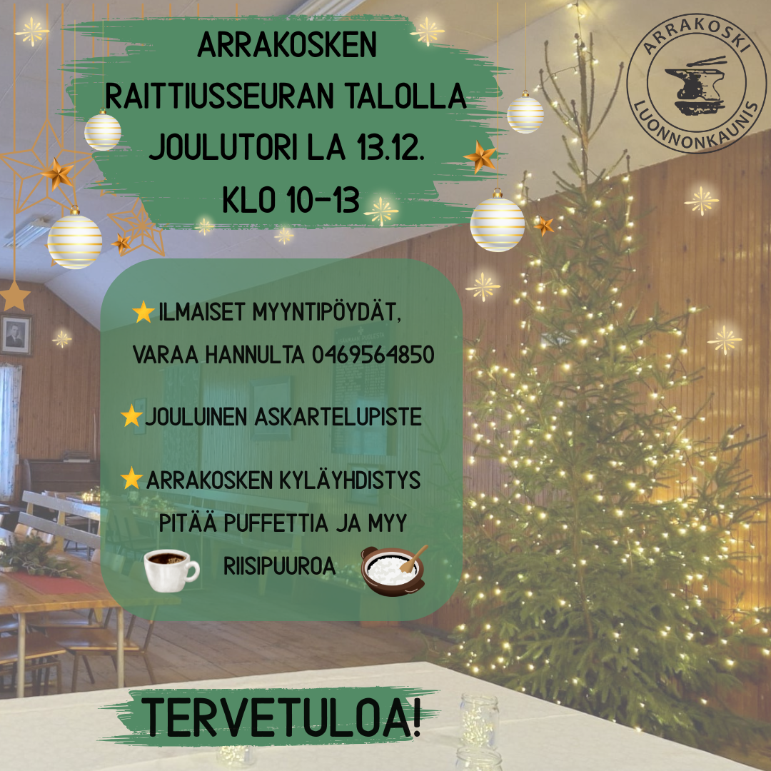 Tervetuloa Arrakosken Raittiusseuran talolle la 13.12. klo 10-13! Joulutorilla monenlaista myytävää. Varaa ilmainen myyntipöytäpaikka Hannulta 0469564850. Arrakosken kyläyhdistys pitää jouluista askartelupistettä ja myy puffetista kahvia, leivonnaisia ja riisipuuroa.