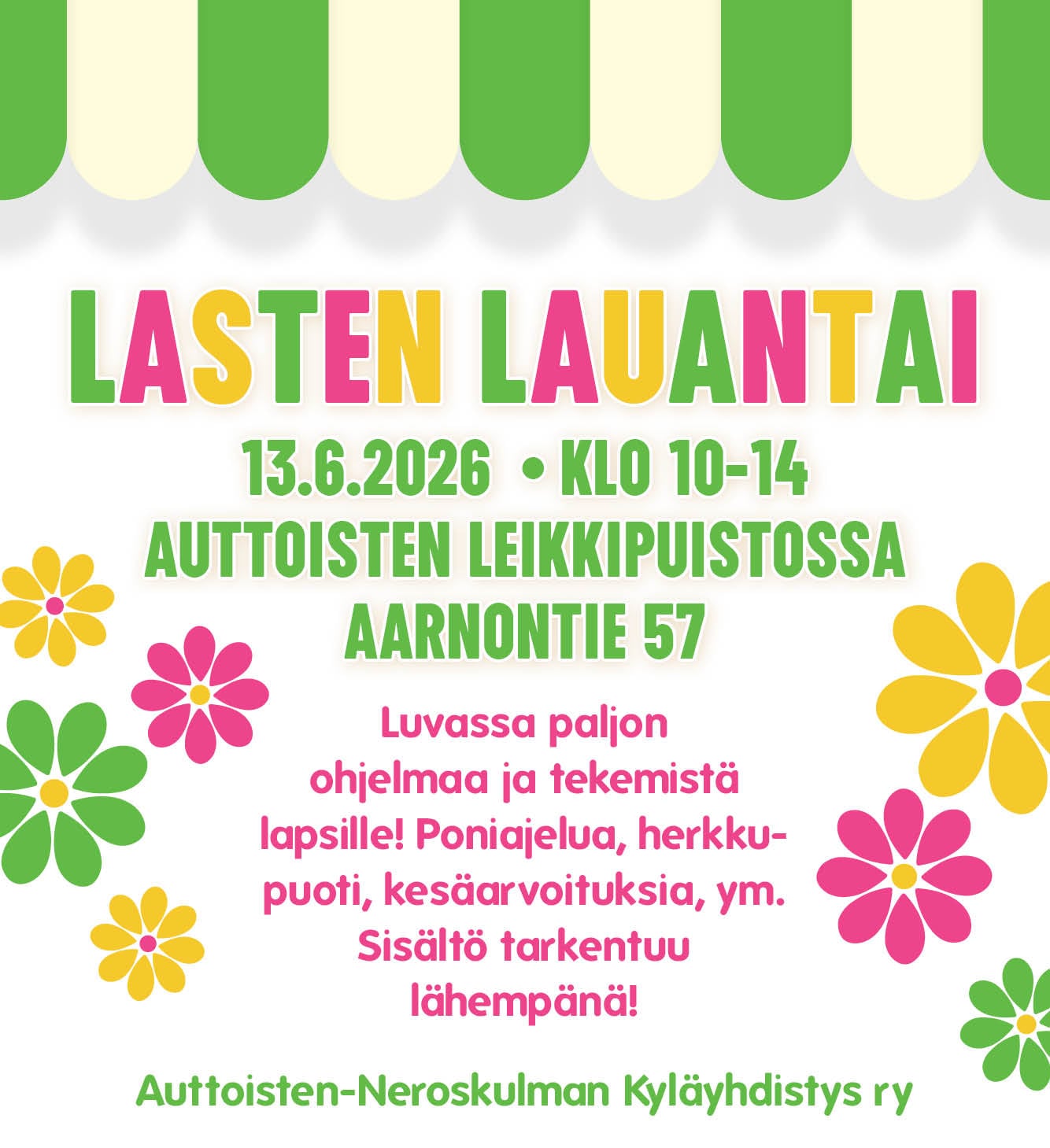 Hyvinvointipalveluiden perinteiset päiväleirit järjestetään jälleen kesäloman ensimmäisellä ja toisella viikolla, v. 2016-2019 syntyneille. 8.-12.6. klo 10-15 askarrellaan, liikutaan, uidaan ja nautitaan kesästä. Päiväleireillä mahdollisuus myös maksulliseen aamu- ja iltapäivähoitoon. Leirin hinta 60€, sis. ohjelma, lounas, välipala ja retken Tampereelle. Ilmoittautuminen avataan 4.5.26. klo 08:00 ja päättyy 25.5. klo 15:00. Mukaan mahtuu 20 innokasta leiriläistä! Paikat […]