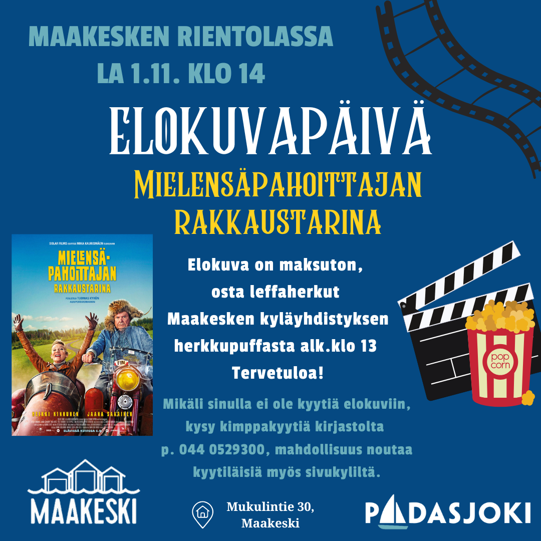 Maakesken Rientolassa vietetään jälleen leffapäivää la 1.11. klo 14! Rientolassa esitetään elokuva Mielensäpahoittajan rakkaustarina, elokuvassa ei ole ikärajaa. Elokuva on maksuton ja avoin kaikille. Herkkukahvio aukeaa jo klo 13 Maakesken kyläyhdistyksen toimesta, myynnissä mm. popparia ja leivonnaisia. Tule ajoissa valitsemaan parhaat paikat ja osta leffaeväät kyläyhdistykseltä. Elokuvan esitys aloitetaan klo 14. Mikäli olet kyytiä vaille […]
