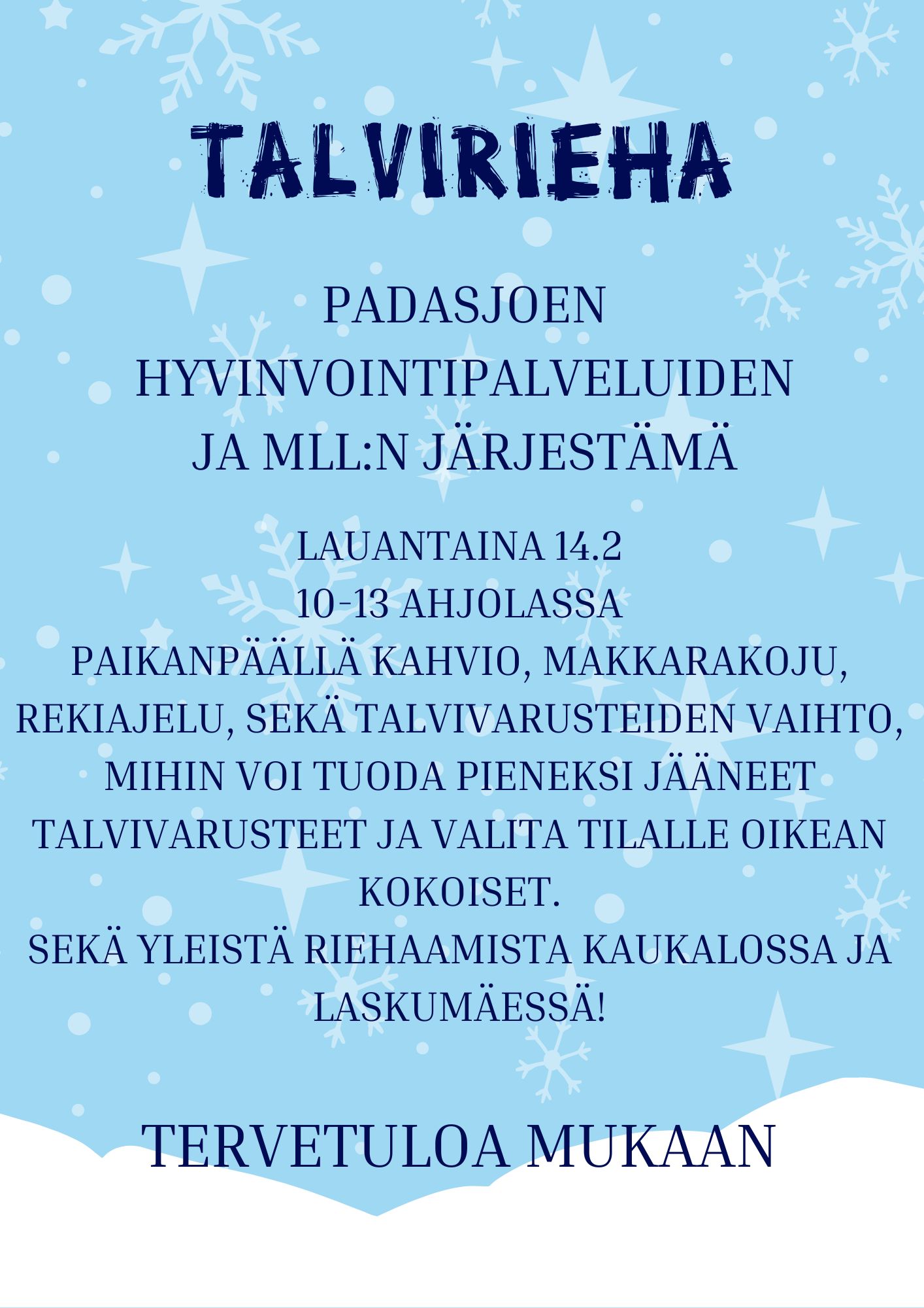 Padasjoen hyvinvointipalvelut ja MLL järjestää yhteistyössä talviriehan Ahjolassa la 14.2. klo 10-13. Kahvio ja makkarakoju paikan päällä. Luistelua, mäenlaskua, moottorikelkkakyytiä ahkiossa sekä talvivarusteiden vaihtopiste. Tuo omia/lasten talvivälineitä ja -vaatteita vaihtopisteelle ja nappaa mukaan vaihdossa sopivammat, jos löytyy. Tervetuloa koko perheen voimin!