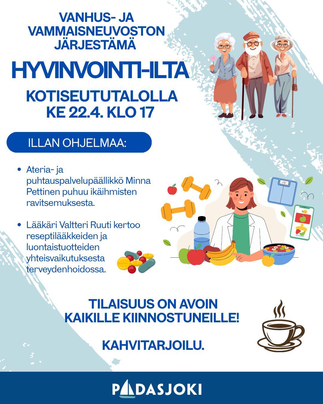 Illan aikana kuullaan ateria ja puhtauspäällikkö Minna Pettisen puheenvuoro ikäihmisten ravitsemuksesta ja lääkäri Valtteri Ruuti kertoo reseptilääkkeiden ja luontaistuotteiden yhteisvaikutuksesta terveydenhoidossa.