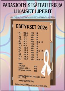 Padasjoen kesäteatterin kesän näytelmä on Tanja Puustisen kirjoittama LIKAISET LIPERIT. Kyseessä on murhamysteeriä ja romantiikkaa yhdistelevä hulvattoman hauska tragikomedia, jossa revitellään rempseillä roolisuorituksilla. Puffetti avoinna tunti ennen esitystä ja väliajalla.