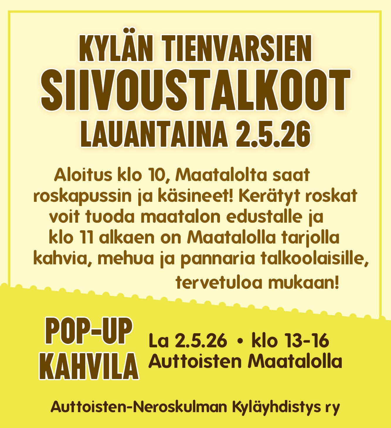 Tienvarret puts plank! Tervetuloa mukaan siivoustalkoisiin. Aloitetaan urakka Auttoisten Maatalolta, mistä saat roskapussin ja käsineet. Kerätyt roskat voit tuoda Maatalon edustalle ja klo 11 alkaen on Maatalolla tarjolla kahvia, mehua ja pannaria ahkerille talkoolaisille!