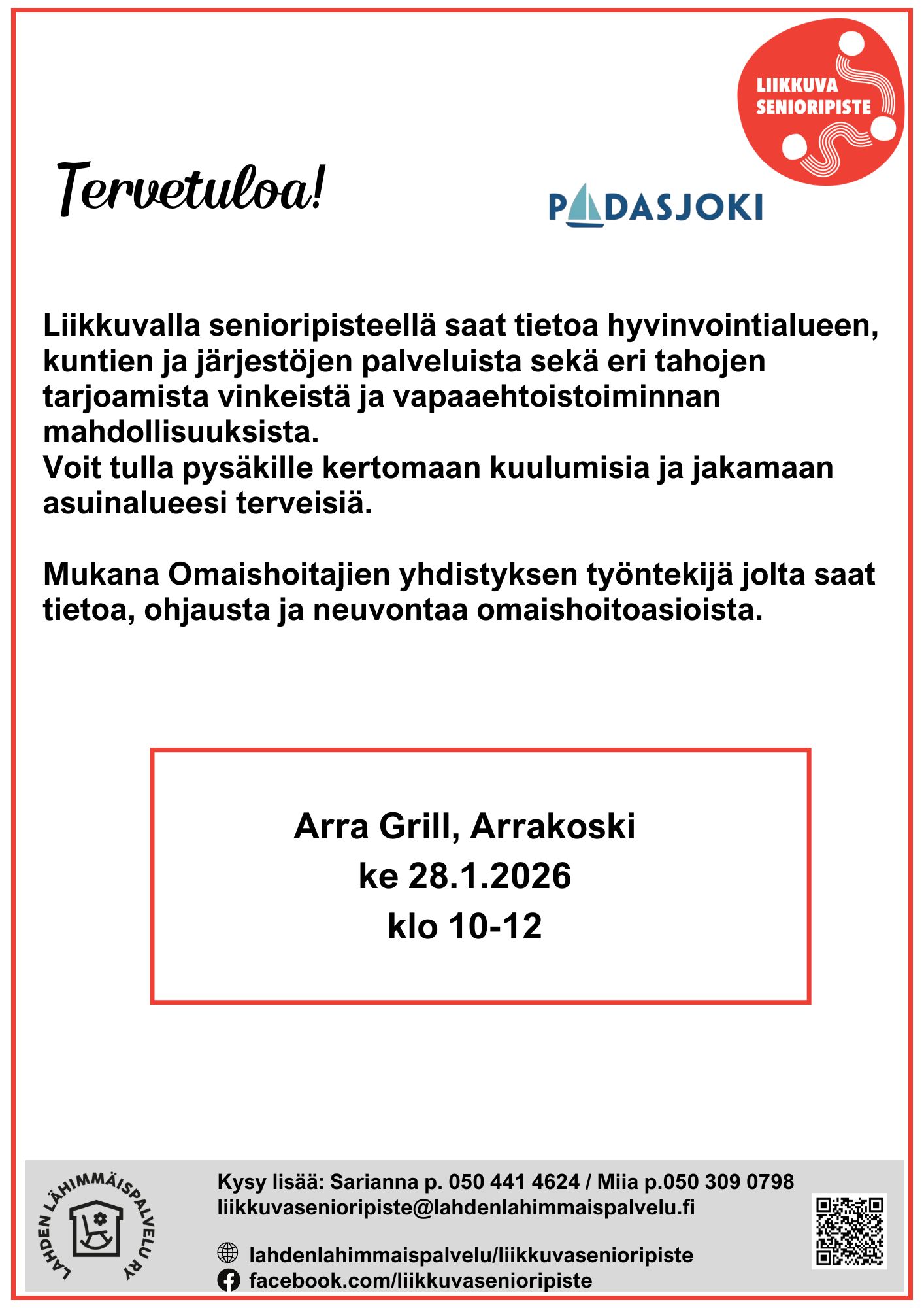 Liikkuvalla senioripisteellä saat tietoa hyvinvointialueen, kuntien ja järjestöjen palveluista sekä eri tahojen tarjoamista vinkeistä ja vapaaehtoistoiminnan mahdollisuuksista.