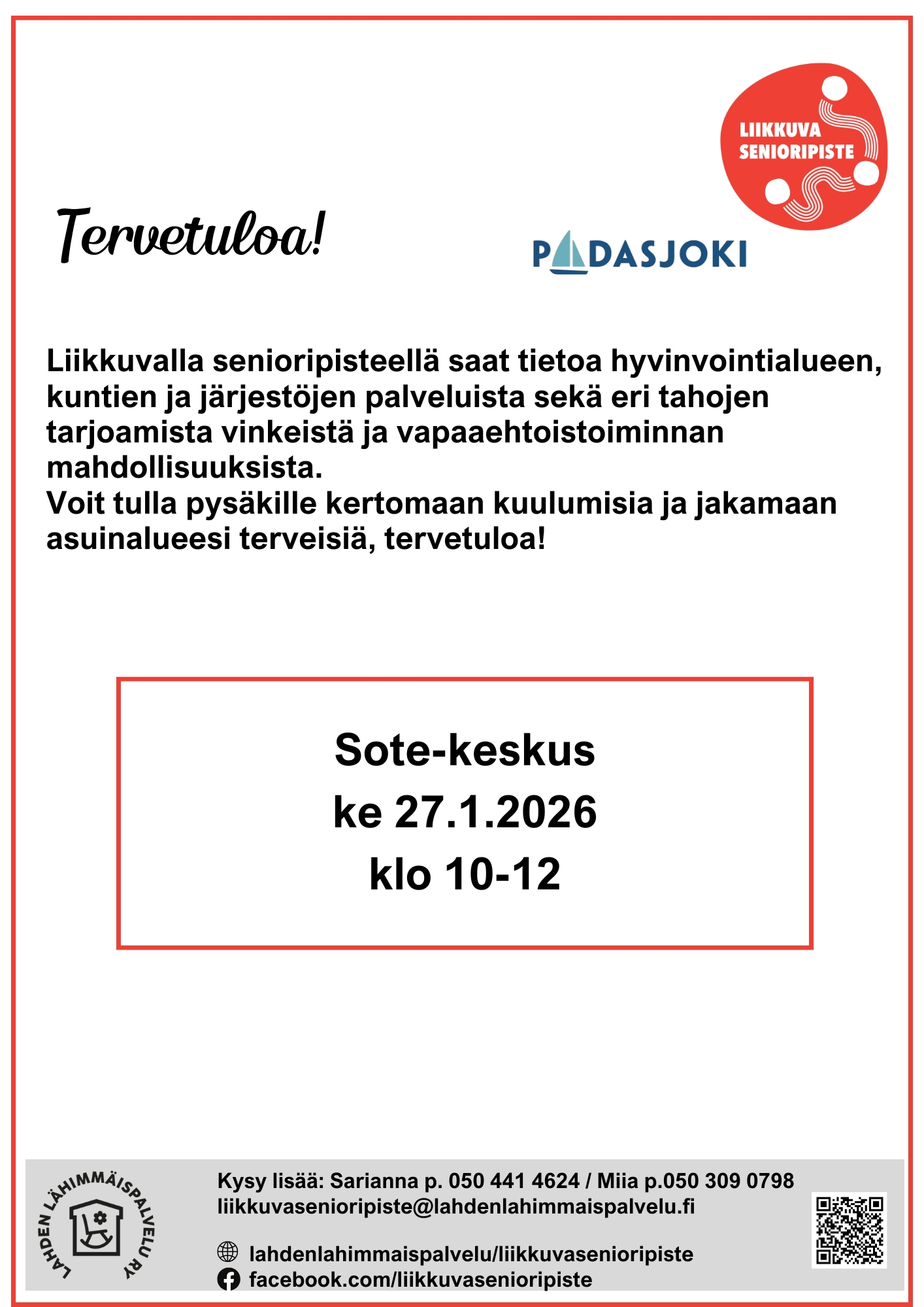 Liikkuvalla senioripisteellä saat tietoa hyvinvointialueen, kuntien ja järjestöjen palveluista sekä eri tahojen tarjoamista vinkeistä ja vapaaehtoistoiminnan mahdollisuuksista. Voit tulla pysäkille kertomaan kuulumisia ja jakamaan asuinalueesi terveisiä.