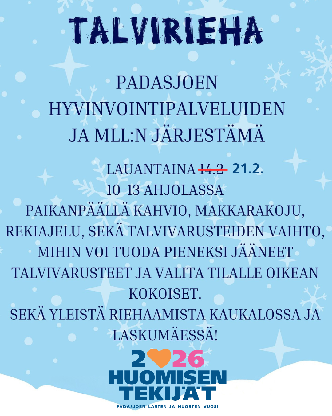 Padasjoen hyvinvointipalvelut ja MLL järjestää yhteistyössä talviriehan Ahjolassa la 14.2. klo 10-13.
